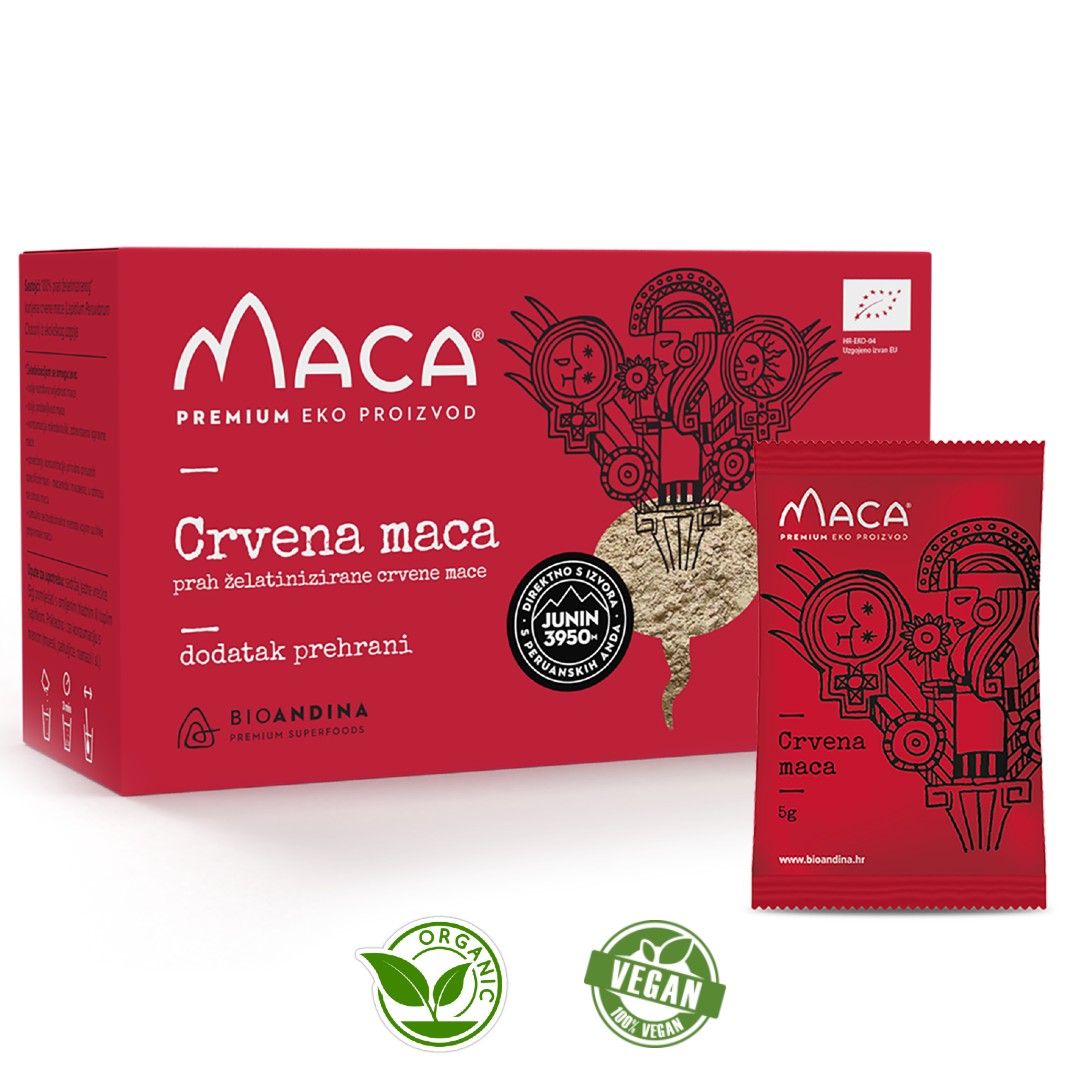 Sadržaj u preporučenoj dnevnoj dozi (=1 vrećica od 5 g): Želatinizirani korijen crvene mace 100%