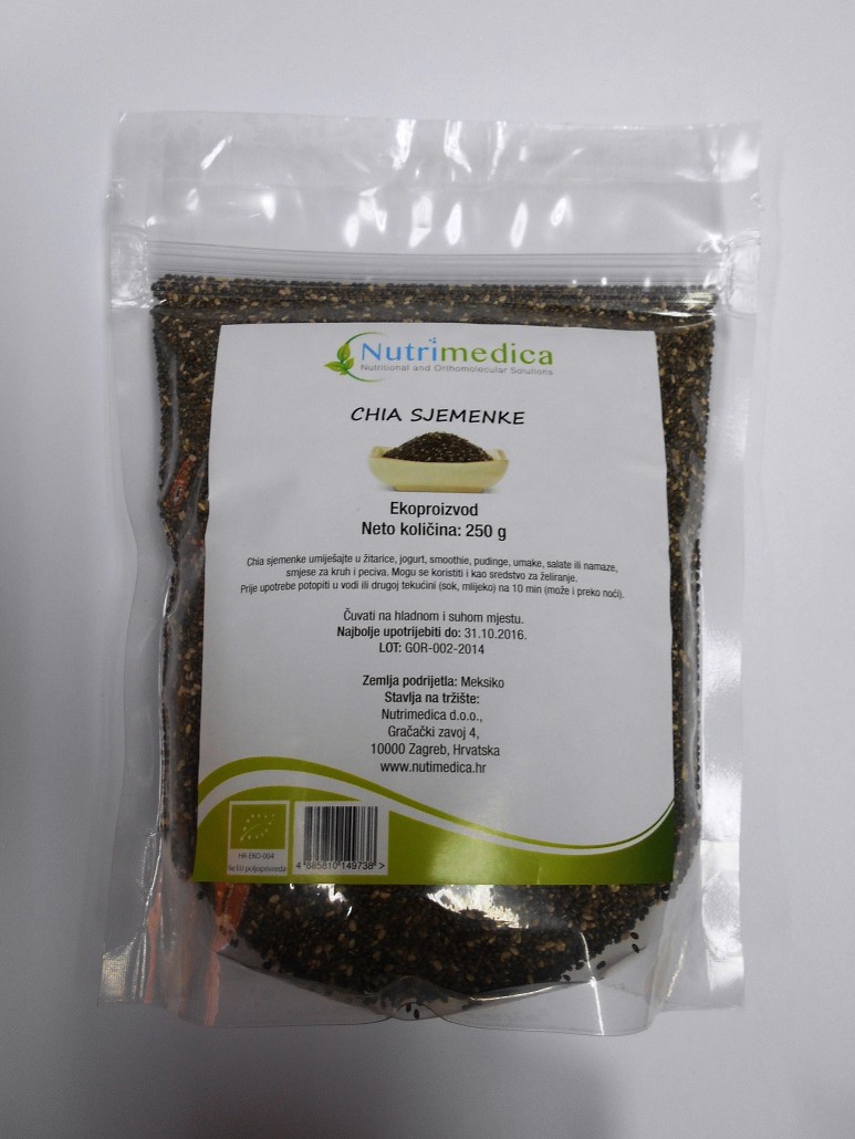 Način primjene: Chia sjemenke se mogu miješati sa žitaricama, jogurtom, smoothie-ima, pudinzima, umacima, salatama ili namazima, smjesama za kruh i pecivima. Mogu se koristiti i kao sredstvo za želiranje. Prije upotrebe potopiti u vodi ili drugoj tekućini (soku, mlijeku ili dr.) te ostaviti najmanje 10 minuta (ili preko noći).